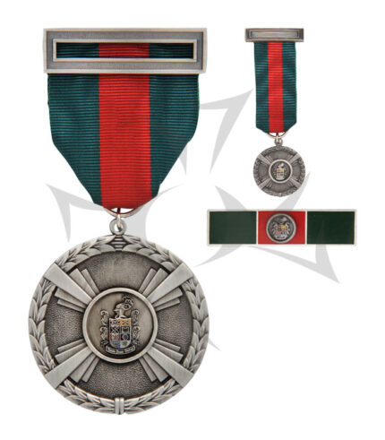 Juego de Medallas elaboradas en crisocal y troqueladas, excelentes acabados en plata antigua, esmalte de color y cinta de calidad Moire. Empacado en estuche de pana japonesa.